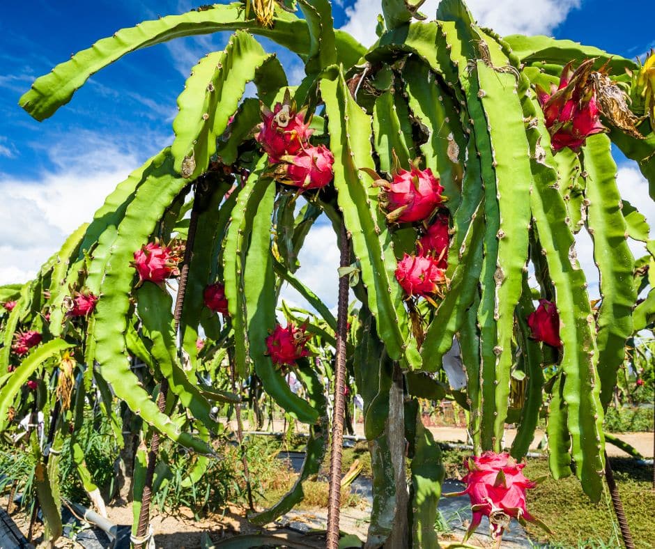 Unlike a classic round cactus that stands alone, pitahaya grows in long, ribbed segments that behave more like a vine—using roots along the stems to grip whatever’s available. (tropical.theferns.info)